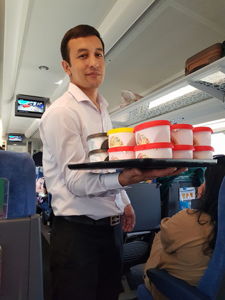 As our train drew up to the platform, we quickly looked for our wagon number. Afrosiyob offered three classes – economy, business and VIP. We had selected economy and were very satisfied with our choice. The seats were comfortable with plenty of leg room, and there was a fair choice of food and drinks for purchase.