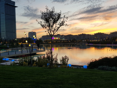 Soon it was sunset. It was around 6.30 or 7:00 pm as it was autumn in Uzbekistan. The natural orange and yellow hues of the setting sun were reflected in the waters of the lake. The artificial blue and purple shades were switched on as well. Dusk at Tashkent City Park was unexpectedly winsome and elegant! Who would have thought?